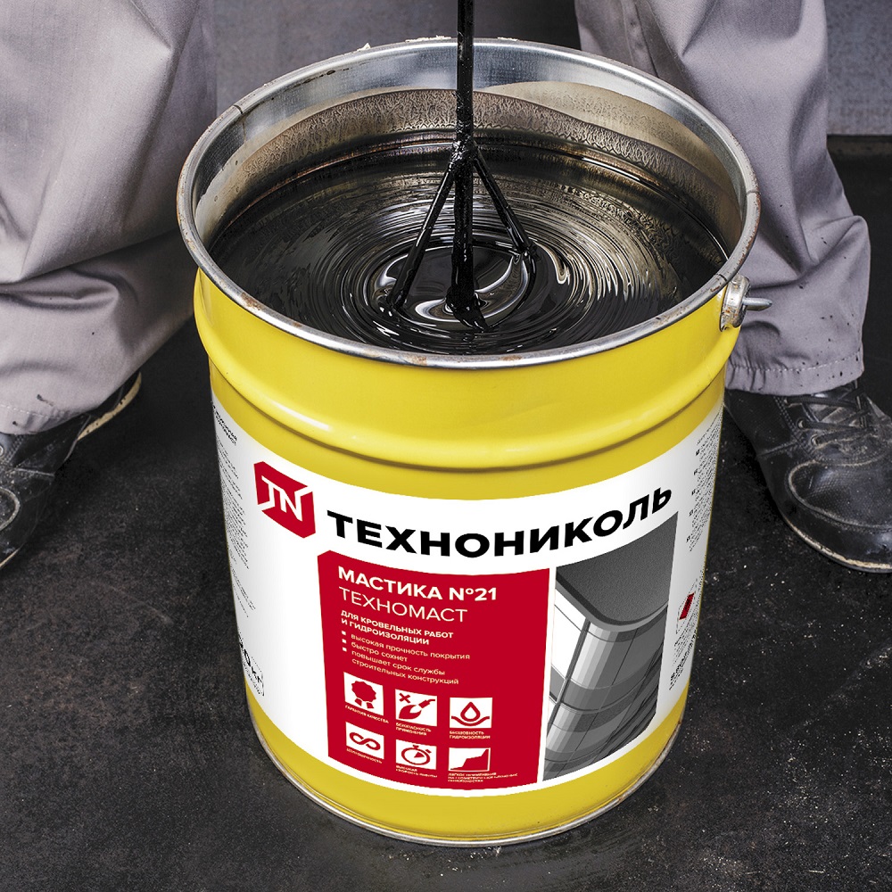 Мастика Технониколь Техномаст №21 кровельная применяется для защиты от влаги различных элементов строительных конструкций, таких как кровли, фундаменты, подвалы, трубы, сваи и другие элементы, которые находятся под землёй.