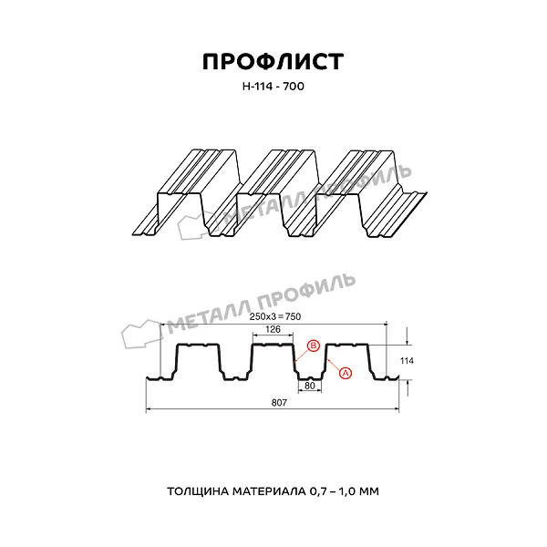 Профлист МЕТАЛЛ ПРОФИЛЬ Н-114x750-A (ОЦ-01-БЦ-1) широко применяется для оформления профилированного листа. Представляет собой металлический оцинкованный лист с покрытием. Общая толщина металла с цинковым и декоративно-защитным покрытием — 1 мм. Проходя процедуру холодного проката, металл приобретает рисунок из ритмичных волн. Несущая способность профилированного листа на порядок выше плоского.